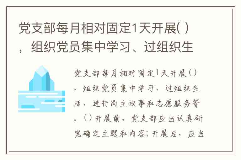党支部每月相对固定1天开展( ),组织党员集中学习、过组织生活、进行民主议事和志愿服务等。( )开展前,党支部应当认真研究确定主题和内容;开展后,应当抓好议定事项的组织落实。对经党组织同意可以不转接组织关系的党员,所在单位党组织可以将其纳入一个党支部或者党小组,参加组织生活。 A.支部活动 支部活动 B.主题党日 主题党日A.支部活动 B.主题党日