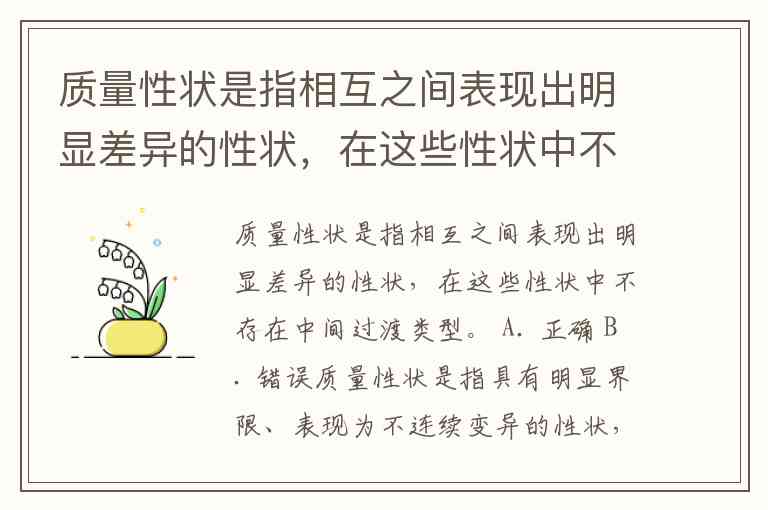 质量性状是指相互之间表现出明显差异的性状,在这些性状中不存在中间过渡类型。 A. 正确 B. 错误