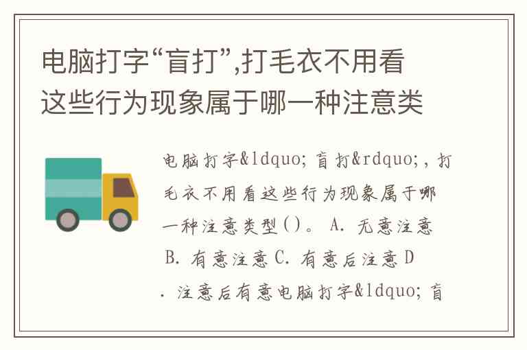 电脑打字“盲打”,打毛衣不用看这些行为现象属于哪一种注意类型( )。 A. 无意注意 B. 有意注意 C. 有意后注意 D. 注意后有意