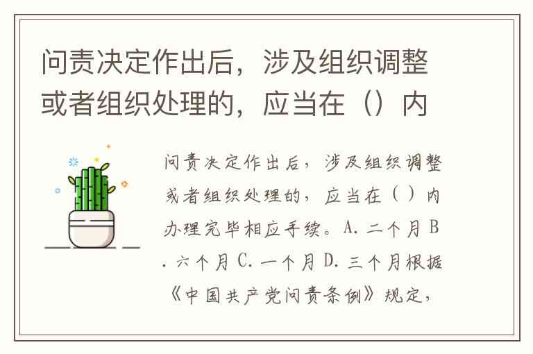 问责决定作出后,涉及组织调整或者组织处理的,应当在()内办理完毕相应手续。A.二个月 B.六个月 C.一个月 D.三个月