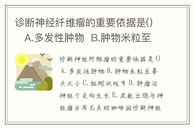 诊断神经纤维瘤的重要依据是() A.多发性肿物 B.肿物米粒至拳头大小 C.蚯蚓状结节 D.肿瘤沿神经干走向生长 E.皮肤出现与神经瘤分布无关的咖啡斑