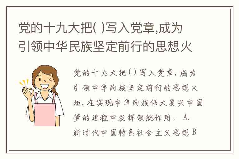 党的十九大把( )写入党章,成为引领中华民族坚定前行的思想火炬,在实现中华民族伟大复兴中国梦的进程中发挥领航作用。 A. 新时代中国特色社会主义思想 B. 中国特色社会主义共同理想 C. 实现中华民族伟大复兴梦想 D. 社会主义核心价值观