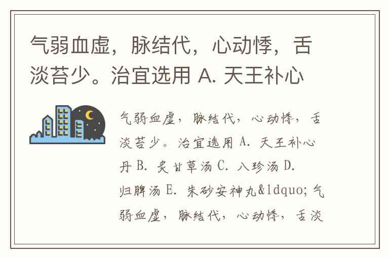 气弱血虚,脉结代,心动悸,舌淡苔少。治宜选用 A. 天王补心丹 B. 炙甘草汤 C. 八珍汤 D. 归脾汤 E. 朱砂安神丸