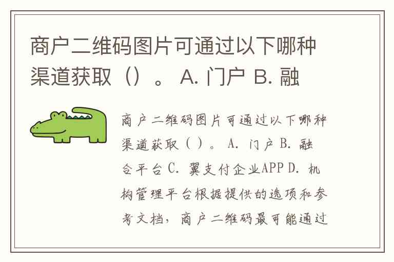 根据提供的选项和参考文档,商户二维码最可能通过A. 门户渠道获取。参考文档显示,微信支付商户可通过访问官方门户网站(如pay.weixin.qq.com)登录商户平台,在后台直接生成或下载收款二维码。例如,在微信支付商户平台的【产品中心】或【收款二维码】选项中,商家可完成二维码的创建与获取,这一流程直接对应“门户”渠道的定义。