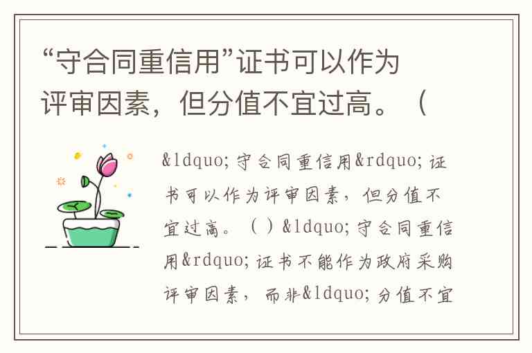 “守合同重信用”证书不能作为政府采购评审因素,而非“分值不宜过高”。这一结论基于多方面政策依据和实践案例:
