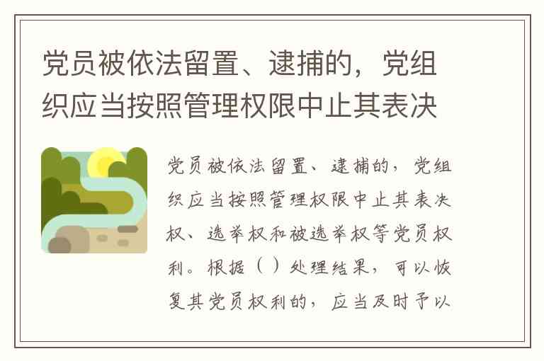 党员被依法留置、逮捕的,党组织应当按照管理权限中止其表决权、选举权和被选举权等党员权利。根据()处理结果,可以恢复其党员权利的,应当及时予以恢复。A.公安机关 B.司法机关 C.行政机关 D.监察机关