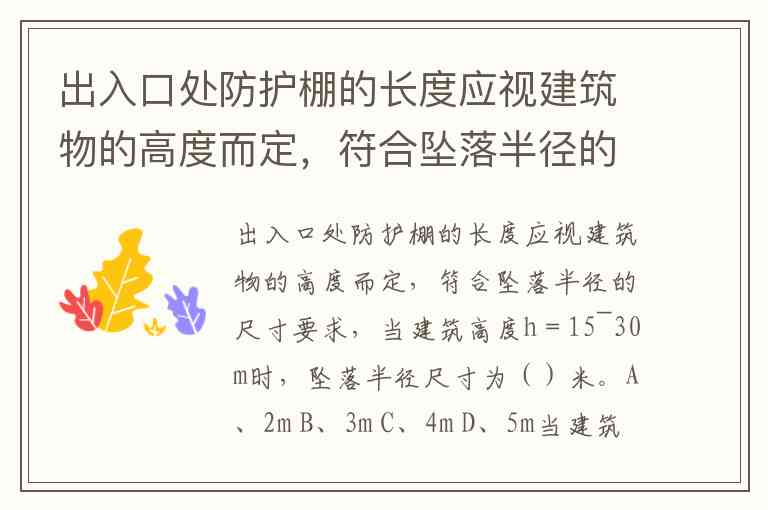 出入口处防护棚的长度应视建筑物的高度而定,符合坠落半径的尺寸要求,当建筑高度h=15~30m时,坠落半径尺寸为()米。A、2m B、3m C、4m D、5m