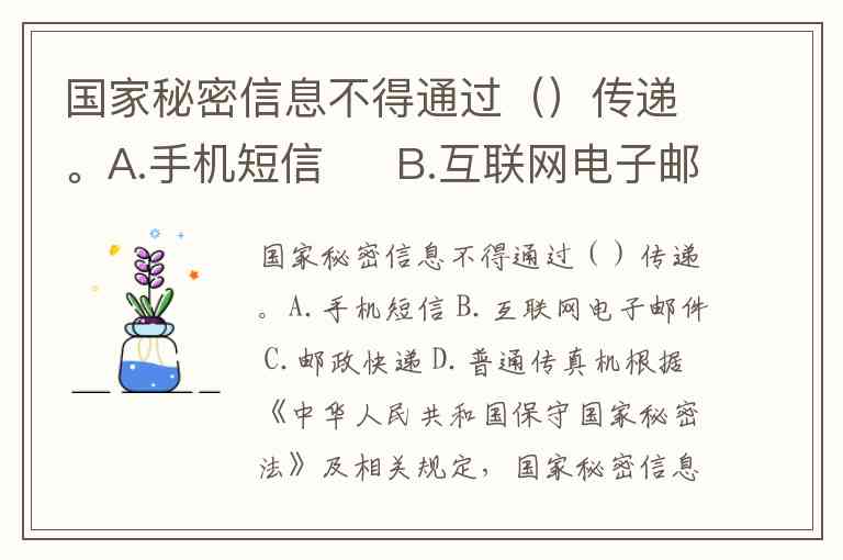 国家秘密信息不得通过()传递。A.手机短信 B.互联网电子邮件 C.邮政快递 D.普通传真机