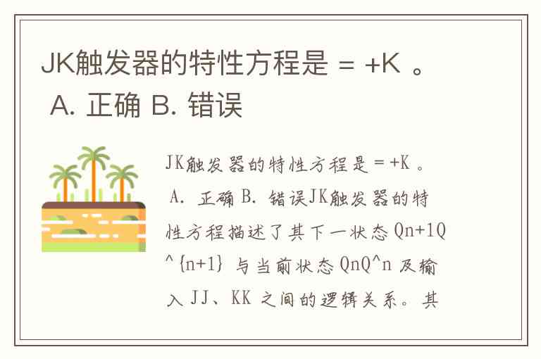JK触发器的特性方程是 = +K 。 A. 正确 B. 错误
