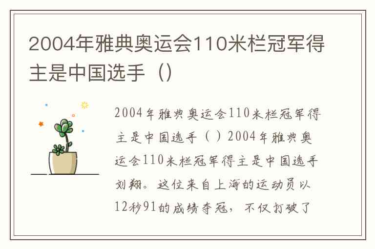2004年雅典奥运会110米栏冠军得主是中国选手刘翔。这位来自上海的运动员以12秒91的成绩夺冠,不仅打破了奥运会纪录,还平了由科林-杰克逊保持的世界纪录,成为中国奥运历史上首位男子田径金牌得主,也是亚洲首位在奥运短跑项目中夺冠的黄种人。