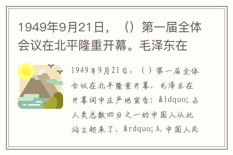 1949年9月21日,()第一届全体会议在北平隆重开幕。毛泽东在开幕词中庄严地宣告:“占人类总数四分之一的中国人从此站立起来了。”A.中国人民代表大会 B.中国人民政治协商会议 C.政务院会议