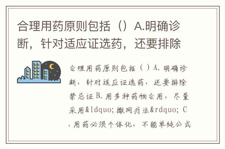 合理用药原则包括()A.明确诊断,针对适应证选药,还要排除禁忌证 B.用多种药物合用,尽量采用“撒网疗法” C.用药必须个体化,不能单纯公式化 D.祛邪扶正并举