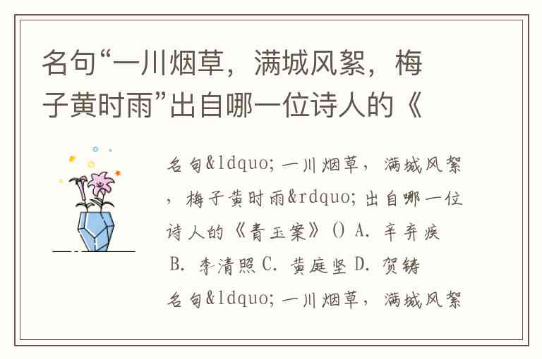 名句“一川烟草,满城风絮,梅子黄时雨”出自哪一位诗人的《青玉案》() A. 辛弃疾 B. 李清照 C. 黄庭坚 D. 贺铸