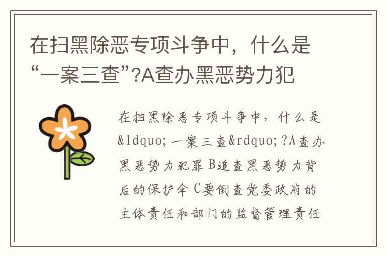 在扫黑除恶专项斗争中,什么是“一案三查”?A查办黑恶势力犯罪 B追查黑恶势力背后的保护伞 C要倒查党委政府的主体责任和部门的监督管理责任