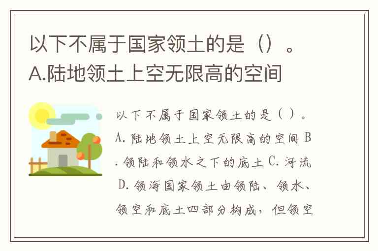 以下不属于国家领土的是()。A.陆地领土上空无限高的空间 B.领陆和领水之下的底土 C.河流 D.领海