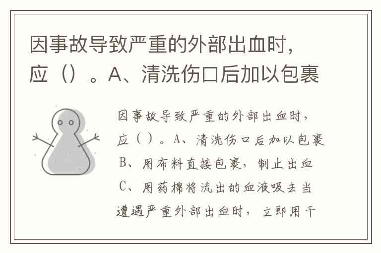因事故导致严重的外部出血时,应()。A、清洗伤口后加以包裹 B、用布料直接包裹,制止出血 C、用药棉将流出的血液吸去