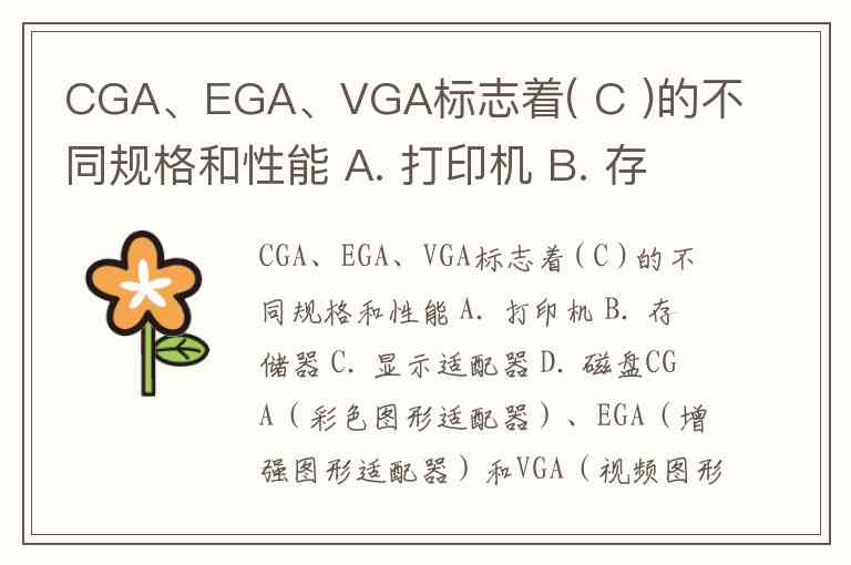 CGA、EGA、VGA标志着( C )的不同规格和性能 A. 打印机 B. 存储器 C. 显示适配器 D. 磁盘