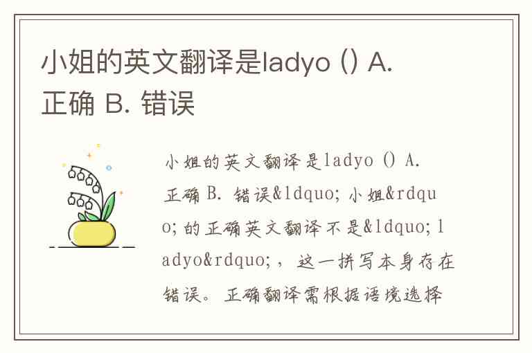 “小姐”的正确英文翻译不是“ladyo”,这一拼写本身存在错误。正确翻译需根据语境选择:正式场合对年轻女性的尊称常用“Ms.”(不指明婚姻状况)或“Miss”(未婚女性);日常称呼年轻女性可用“young lady”;而“lady”虽可指“女士”,但更强调优雅气质,且没有“ladyo”这一英文单词。因此答案应为B. 错误。