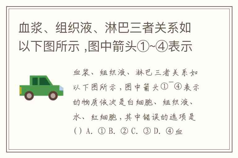 血浆、组织液、淋巴三者关系如以下图所示 ,图中箭头①~④表示的物质依次是白细胞、组织液、水、红细胞 ,其中错误的选项是( ) A. ① B. ② C. ③ D. ④