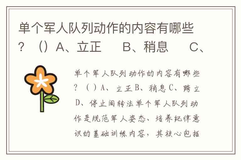 单个军人队列动作的内容有哪些?()A、立正 B、稍息 C、跨立 D、停止间转法
