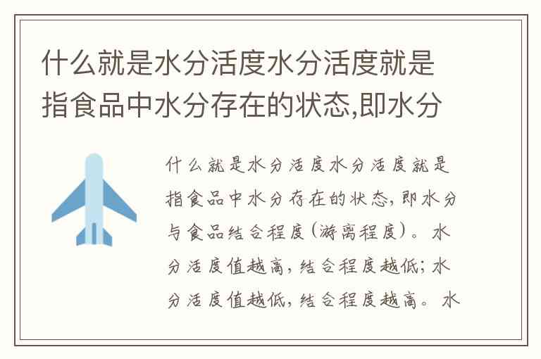 什么就是水分活度水分活度就是指食品中水分存在的状态,即水分与食品结合程度(游离程度)。水分活度值越高,结合程度越低;水分活度值越低,结合程度越高。水分活度数值用Aw表示的,水分活度值等于用百分率表示的相对湿度,其数值在0-1之间。溶液中水的蒸气分压P与纯水__Q的比值,Aw=P/Q。