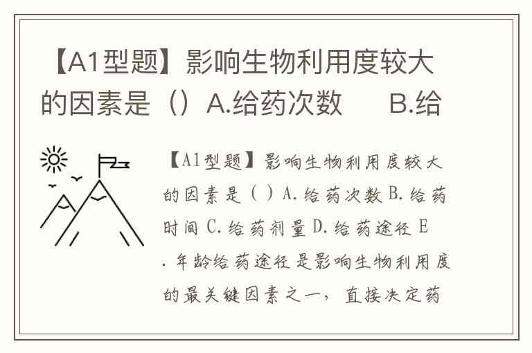 【A1型题】影响生物利用度较大的因素是()A.给药次数 B.给药时间 C.给药剂量 D.给药途径 E.年龄