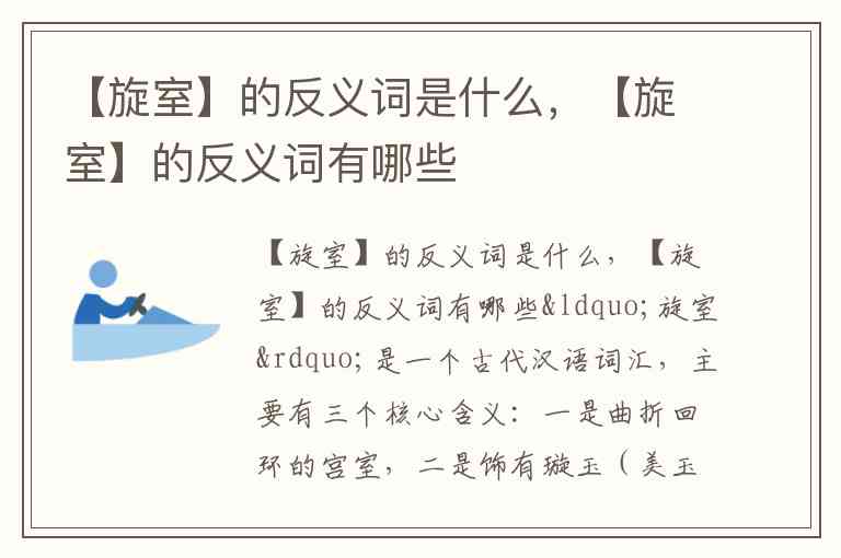 “旋室”是一个古代汉语词汇,主要有三个核心含义:一是曲折回环的宫室,二是饰有璇玉(美玉)的宫室(“旋”通“璇”),三是装有旋转机关的宫室,常见于古籍中描述帝王奢华建筑或神话场景,如《淮南子》提到的“昆仑阊阖之中”的宫殿。由于它是特定历史语境下的建筑术语,现代汉语中并无明确对应的标准反义词,但可根据其不同含义从三个维度构建反义概念: