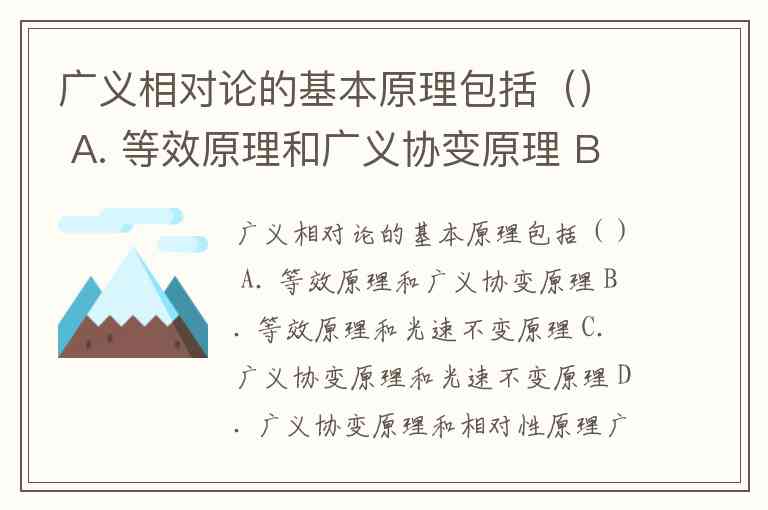 广义相对论的基本原理包括等效原理和广义协变原理,对应选项A。这两个原理构成了广义相对论的理论基石,前者揭示了引力与加速度的本质联系,后者则将物理定律的普适性推广到所有参考系。