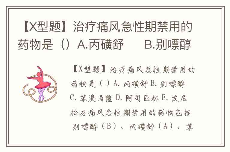 【X型题】治疗痛风急性期禁用的药物是()A.丙磺舒 B.别嘌醇 C.苯溴马隆 D.阿司匹林 E.泼尼松龙