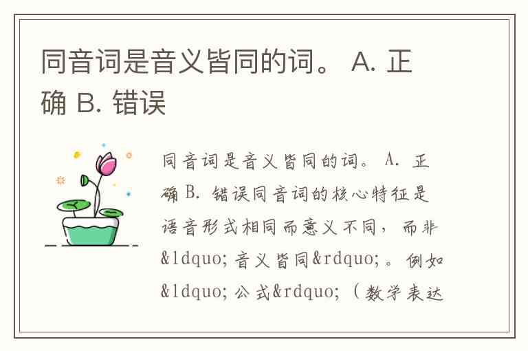 同音词是音义皆同的词。 A. 正确 B. 错误