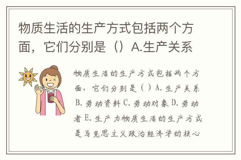 物质生活的生产方式包括两个方面,它们分别是()A.生产关系 B.劳动资料 C.劳动对象 D.劳动者 E.生产力
