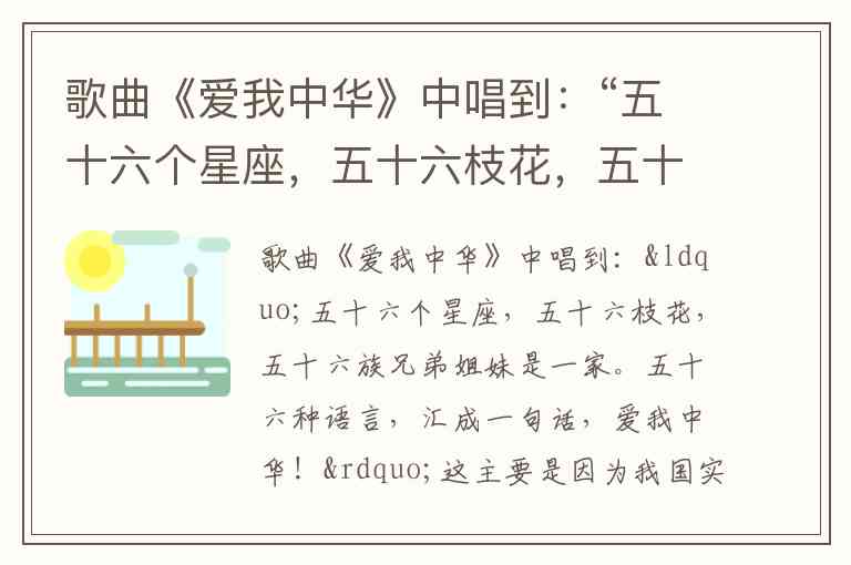 《爱我中华》歌词中“五十六族兄弟姐妹是一家”的生动写照,其制度根基正是我国的民族区域自治制度。这一制度作为解决民族问题的基本政策,在国家统一领导下保障各少数民族聚居区自主管理内部事务,既维护了国家主权完整,又实现了各民族平等团结与共同发展,成为歌词中民族团结景象的政治保障。