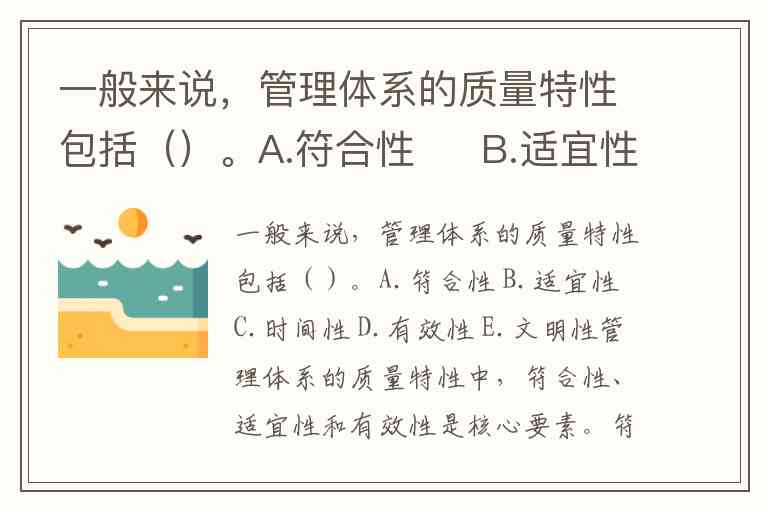 一般来说,管理体系的质量特性包括()。A.符合性 B.适宜性 C.时间性 D.有效性 E.文明性