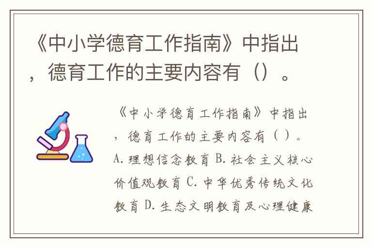 答案:ABCD。这四项内容共同构成了《指南》"五位一体"的德育体系,体现了从理想信念到文化传承、从生态意识到心理素养的全面培养目标。当前中小学德育是否还需增加数字伦理等新内容?这一问题值得教育工作者思考。