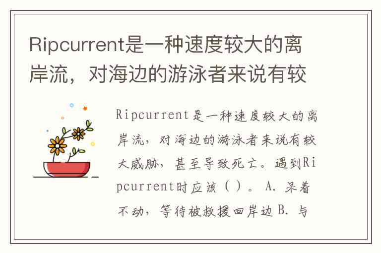 Ripcurrent是一种速度较大的离岸流,对海边的游泳者来说有较大威胁,甚至导致死亡。遇到Ripcurrent时应该()。 A. 呆着不动,等待被救援回岸边 B. 与Ripcurrent搏斗,逆游回岸边 C. 屏住呼吸,潜水至深处,游回岸边 D. 顺着Ripcurrent游,出强流区后,从两侧游回岸边