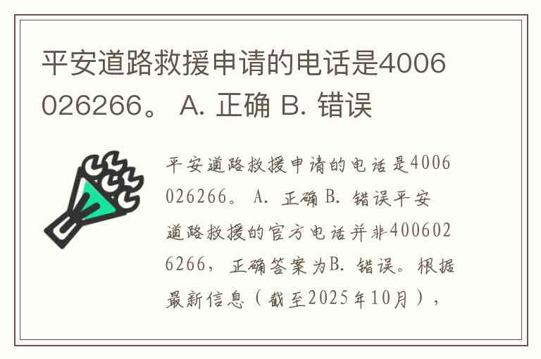平安道路救援的官方电话并非4006026266,正确答案为B. 错误。根据最新信息(截至2025年10月),平安车险的统一道路救援电话为95511转9,提供7×24小时服务,覆盖拖车、紧急送油、换胎等场景[6][8]。该号码适用于12座以下非营业车辆,且需满足保单生效、在城市中心区100公里内等条件[4][5]。