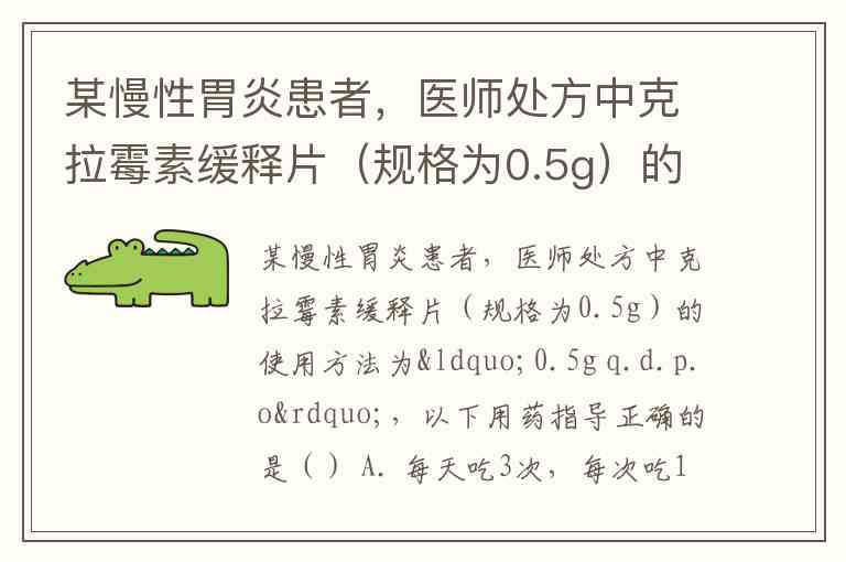 医师处方中克拉霉素缓释片“0.5g q.d.p.o”的正确用药指导为每天吃1次,每次吃1片(选项B)。其中“q.d.”为拉丁语“quaque die”的缩写,意为“每日一次”,而该药品规格为0.5g/片,与处方剂量完全匹配。