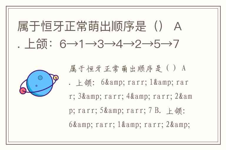 属于恒牙正常萌出顺序是() A. 上颌:6→1→3→4→2→5→7 B. 上颌:6→1→2→3→4→5→7 C. 下颌:6→1→2→3→5→4→7 D. 上颌:6→1→2→4→5→3→7 E. 以上都对
