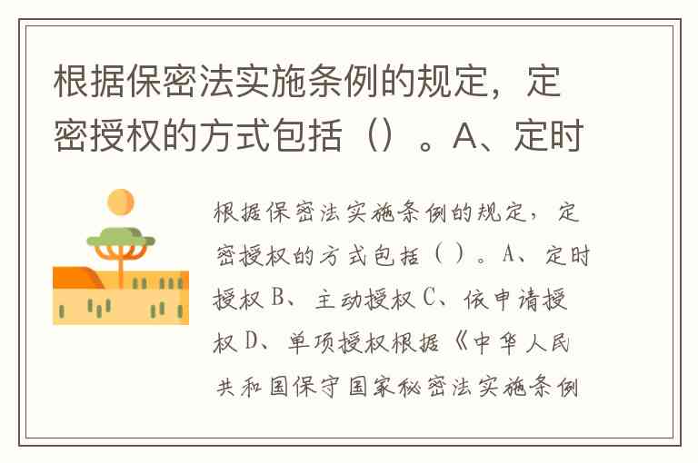 根据保密法实施条例的规定,定密授权的方式包括()。A、定时授权 B、主动授权 C、依申请授权 D、单项授权