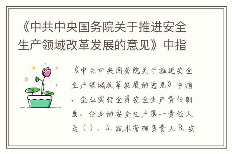《中共中央国务院关于推进安全生产领域改革发展的意见》中指,企业实行全员安全生产责任制度,企业的安全生产第一责任人是()。A.技术管理负责人 B.安全管理负责人 C.企业董事会 D.法定代表人和实际控制