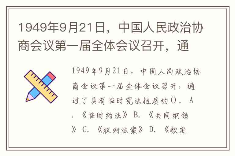 1949年9月21日,中国人民政治协商会议第一届全体会议召开,通过了具有临时宪法性质的()。 A. 《临时约法》 B. 《共同纲领》 C. 《权利法案》 D. 《钦定宪法大纲》