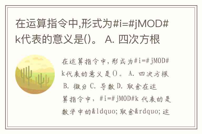 在运算指令中,形式为#i=#jMOD#k代表的意义是()。 A. 四次方根 B. 微分 C. 导数 D. 取余