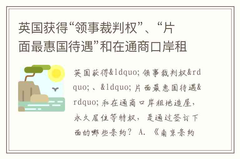 英国获得“领事裁判权”、“片面最惠国待遇”和在通商口岸租地造屋,永久居住等特权,是通过签订下面的哪些条约? A. 《南京条约》 B. 《条约》 C. 《中美望厦条约》 D. 《黄埔条约》