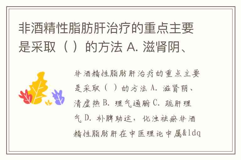 非酒精性脂肪肝治疗的重点主要是采取( )的方法 A. 滋肾阴、清虚热 B. 理气通腑 C. 疏肝理气 D. 补脾助运,化浊祛瘀