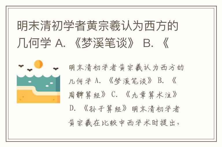 明末清初学者黄宗羲认为西方的几何学 A. 《梦溪笔谈》 B. 《周髀算经》 C. 《九章算术注》 D. 《孙子算经》