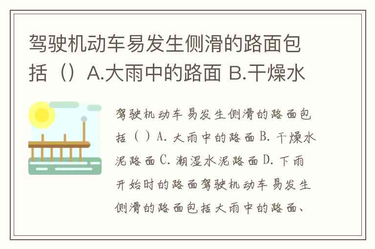 驾驶机动车易发生侧滑的路面包括()A.大雨中的路面 B.干燥水泥路面 C.潮湿水泥路面 D.下雨开始时的路面