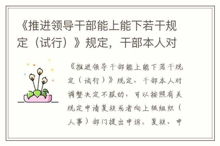 《推进领导干部能上能下若干规定(试行)》明确,干部对调整决定不服时虽享有申请复核或申诉的权利,但复核、申诉期间不停止调整决定的执行。这一制度设计既保障了干部的救济权,又维护了组织处理的权威性和时效性,避免因程序拖延影响工作开展。