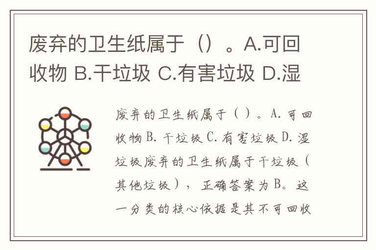 废弃的卫生纸属于干垃圾(其他垃圾),正确答案为 B。