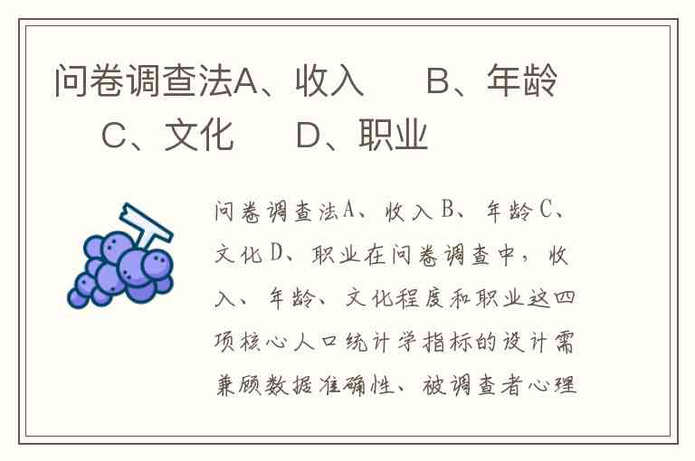问卷调查法A、收入 B、年龄 C、文化 D、职业