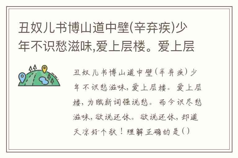 丑奴儿书博山道中壁(辛弃疾)少年不识愁滋味,爱上层楼。爱上层楼,为赋新词强说愁。而今识尽愁滋味,欲说还休。欲说还休,却道天凉好个秋 ! 理解正确的是( ) A. A “强说愁”写出了年轻人的志高远大、好胜纯真。 B. “欲说还休”写出了词人的矛盾心理,孤独压抑。 C. C 词的末句形似轻松洒脱,实则无法排遣沉重抑郁。 D. 通篇言“愁”,表达了遭到排挤、报国无门的哀愁。
